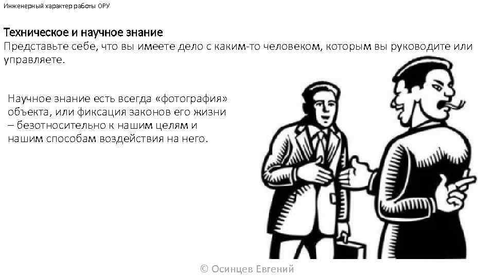Инженерный характер работы ОРУ Техническое и научное знание Представьте себе, что вы имеете дело с каким-то человеком, которым вы руководите или управляете. Научное знание есть всегда «фотография» объекта, или фиксация законов его жизни – безотносительно к нашим целям и нашим способам воздействия на него. © Осинцев Евгений