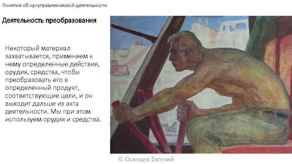Понятие об оргуправленческой деятельности Деятельность преобразования Некоторый материал захватывается, применяем к нему определенные действия, орудия, средства, чтобы преобразовать его в определенный продукт, соответствующие цели, и он выходит дальше из акта деятельности. Мы при этом используем орудия и средства. © Осинцев Евгений