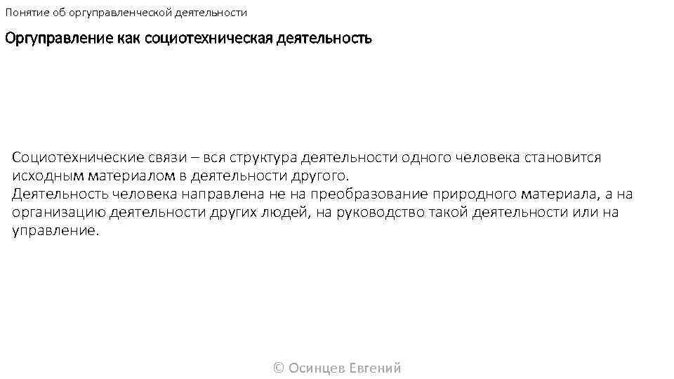 Понятие об оргуправленческой деятельности Оргуправление как социотехническая деятельность Социотехнические связи – вся структура деятельности одного человека становится исходным материалом в деятельности другого. Деятельность человека направлена не на преобразование природного материала, а на организацию деятельности других людей, на руководство такой деятельности или на управление. © Осинцев Евгений