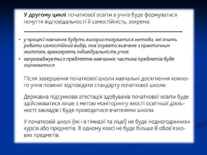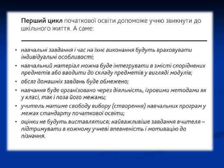 Нормативно-правова база: q Державний стандарт початкової загальної освіти (2011) q «Щодо методичних рекомендацій про викладання навчальних предметів у ЗНЗ» (Лист МОН України від 17. 08. 2016 1/9 -437) q Ключові тези орієнтовних вимог до оцінювання навчальних досягнень учнів 1 -4 класів (Наказ МОН від 19. 08. 2016 № 1009 "Про внесення змін до наказу Міністерства освіти і науки України від 21. 08. 2013 № 1222") та методичних рекомендацій до оновлених програм початкової школи (1 -4 клас) (Лист МОН України від 17. 08. 2016 № 1/9 -437) q Про організаційно-методичні засади забезпечення навчально-виховного процесу для учнів з особливими освітніми потребами ЗНЗ у 2016/2017 н. р. (Лист МОН № 1/9 -364 від 12. 07. 16 р. )