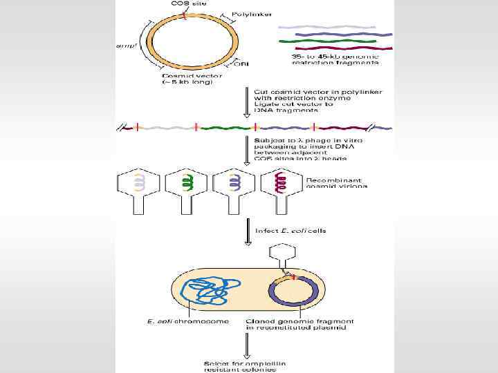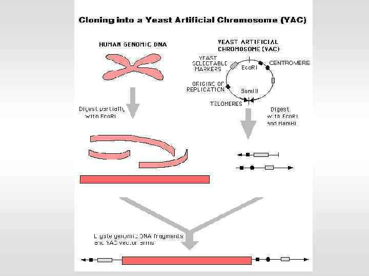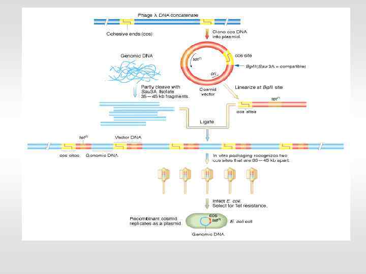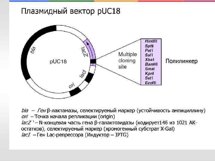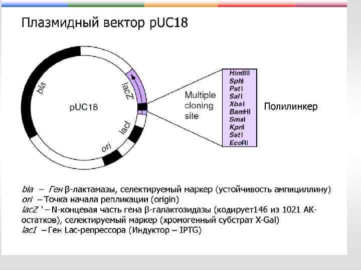 Векторная ДНК: • автономная репликация в бактериях или дрожжах • устойчивость к антибиотику • удобные сайты рестрикции (MCS) Размер вставки, которую могут переносить: - плазмиды - до 10 тыс. пар оснований (п. о. ) - вирусы (фаги) - до 25 тыс. п. о. - космиды - в среднем 45 тыс. п. о. - бактериальные искусственные хромосомы – до 300 тыс. п. о. - дрожжевые искусственные хромосомы - до 1 млн. п. о.