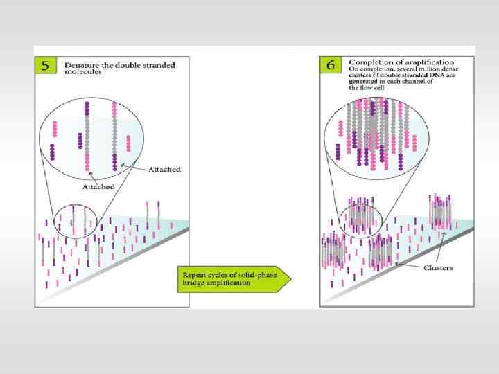 Секвенирование методом синтеза на матрице. Illumina Фрагменты ss. ДНК закрепляют на твердой подложке ДНК полимераза синтезирует комплементарную цепь Встраивание каждого нового нуклеотида регистрируется по флюоресценции Подготовка образцов ДНК и прикрепление к кластерам