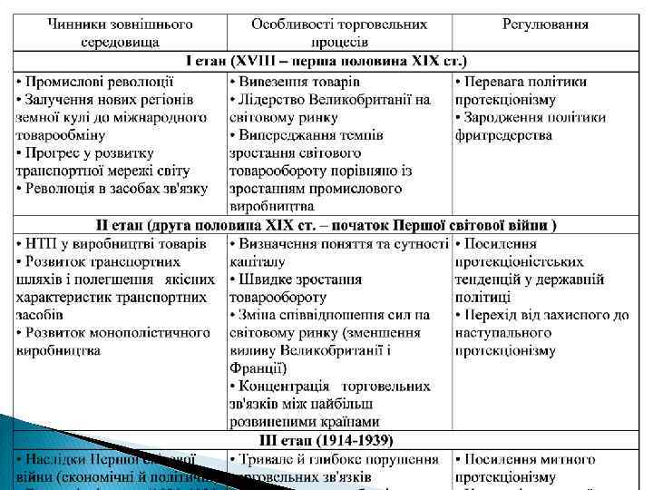 Фактори міжнародної торгівлі 1) поглиблення міжнародного поділу праці та інтернаціоналізація виробництва; 2) упровадження досягнень науково-технічної революції, що, зокрема, виявляється в оновленні основного капіталу, створенні нових видів продукції, виникненні нових галузей економіки та реконструкції традиційних; 3) активізація діяльності транснаціональних корпорацій на світовому ринку; 4) лібералізація міжнародної торгівлі на дво і багатосторонній основі, що виявляється у скасуванні або зниженні тарифних і нетарифних обмежень, утворенні вільних економічних зон, запровадженні спільного підприємництва; 5) розвиток торговельно-економічної інтеграції за допомогою утворення зон вільної торгівлі, введення єдиного тарифу на товари для країн, які не беруть участі в економічних об'єднаннях, формування спільних ринків і валютноекономічних союзів; 6) здобуття політичної незалежності територіями, які раніше належали до колоніальних імперій, і поява нових індустріальних держав.