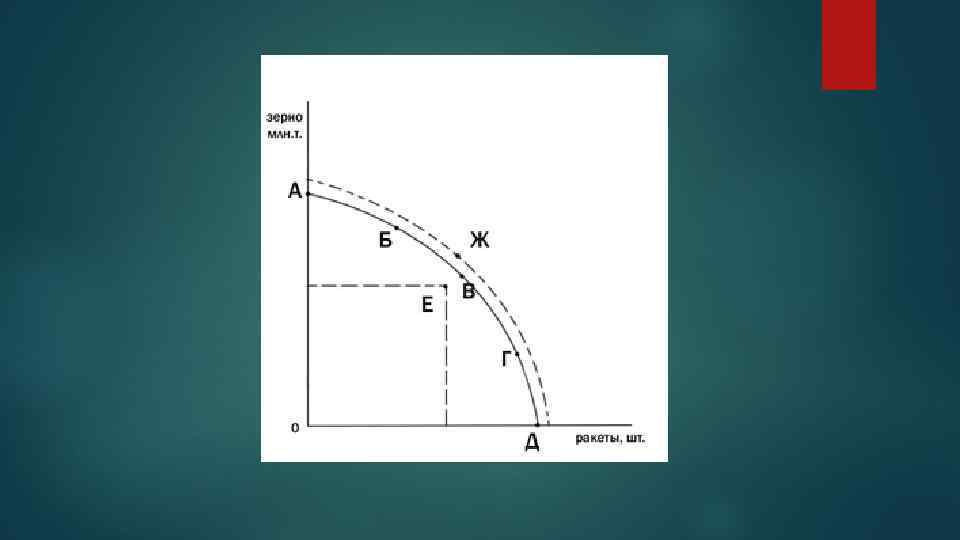 Выводы Ø Ø Модель кривой производственных возможностей позволяет проиллюстрировать четыре важных положения: Ограниченность ресурсов — об этом свидетельствует существование области недостижимых значений (точка Ж) Необходимость выбора — общество вынуждено определять, какое сочетание товаров Х и У в наилучшей степени удовлетворяет его интересы. Наличие альтернативных издержек — об этом свидетельствует убывающий характер кривой, поскольку для производства дополнительной единицы одного товара надо отказаться от выпуска какой-либо величины другого товара. Возрастание альтернативных издержек — выпуклый характер КПВ.