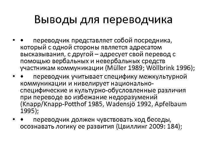 Выводы для переводчика • • переводчик представляет собой посредника, который с одной стороны является адресатом высказывания, с другой – адресует свой перевод с помощью вербальных и невербальных средств участникам коммуникации (Müller 1989; Wöllbrink 1996); • • переводчик учитывает специфику межкультурной коммуникации и нивелирует национальноспецифические и культурно-обусловленные различия при переводе во избежание недоразумений (Knapp/Knapp-Potthof 1985, Wadensjö 1992, Apfelbaum 1995); • • переводчик должен чувствовать ход беседы, осознавать логику ее развития (Цвиллинг 2009: 184);