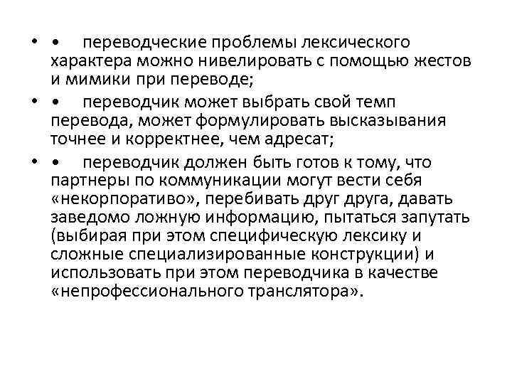 • • переводческие проблемы лексического характера можно нивелировать с помощью жестов и мимики при переводе; • • переводчик может выбрать свой темп перевода, может формулировать высказывания точнее и корректнее, чем адресат; • • переводчик должен быть готов к тому, что партнеры по коммуникации могут вести себя «некорпоративо» , перебивать друга, давать заведомо ложную информацию, пытаться запутать (выбирая при этом специфическую лексику и сложные специализированные конструкции) и использовать при этом переводчика в качестве «непрофессионального транслятора» .