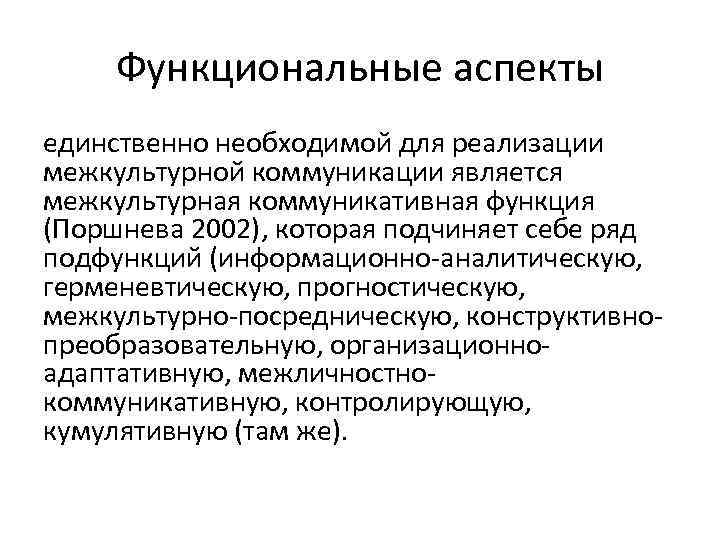 Функциональные аспекты единственно необходимой для реализации межкультурной коммуникации является межкультурная коммуникативная функция (Поршнева 2002), которая подчиняет себе ряд подфункций (информационно-аналитическую, герменевтическую, прогностическую, межкультурно-посредническую, конструктивнопреобразовательную, организационноадаптативную, межличностнокоммуникативную, контролирующую, кумулятивную (там же).