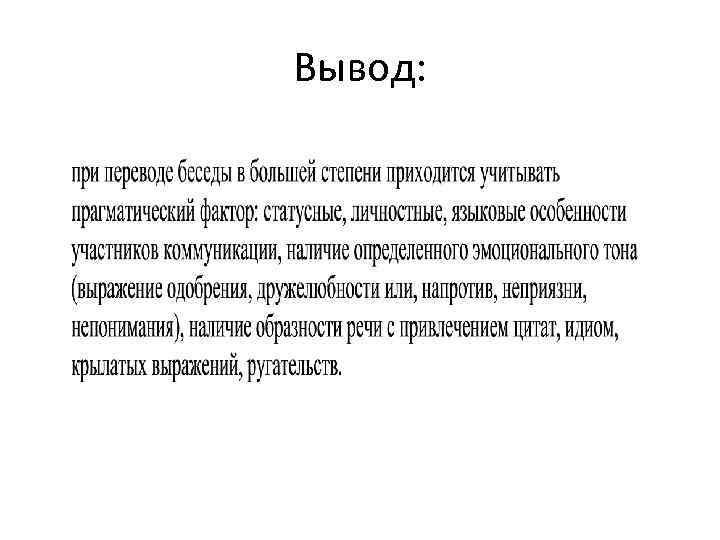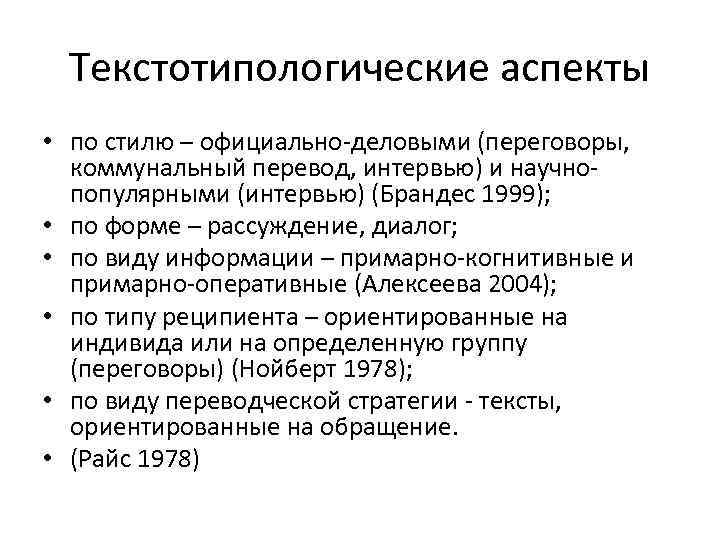 Текстотипологические аспекты • по стилю – официально-деловыми (переговоры, коммунальный перевод, интервью) и научнопопулярными (интервью) (Брандес 1999); • по форме – рассуждение, диалог; • по виду информации – примарно-когнитивные и примарно-оперативные (Алексеева 2004); • по типу реципиента – ориентированные на индивида или на определенную группу (переговоры) (Нойберт 1978); • по виду переводческой стратегии - тексты, ориентированные на обращение. • (Райс 1978)