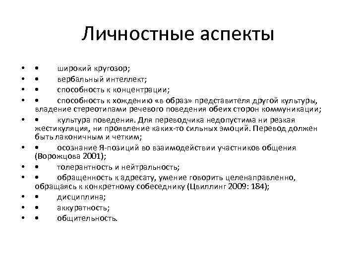 Личностные аспекты • • • широкий кругозор; • вербальный интеллект; • способность к концентрации; • способность к хождению «в образ» представителя другой культуры, владение стереотипами речевого поведения обеих сторон коммуникации; • культура поведения. Для переводчика недопустима ни резкая жестикуляция, ни проявление каких-то сильных эмоций. Перевод должен быть лаконичным и четким; • осознание Я-позиций во взаимодействии участников общения (Ворожцова 2001); • толерантность и нейтральность; • обращенность к адресату, умение говорить целенаправленно, обращаясь к конкретному собеседнику (Цвиллинг 2009: 184); • дисциплина; • аккуратность; • общительность.