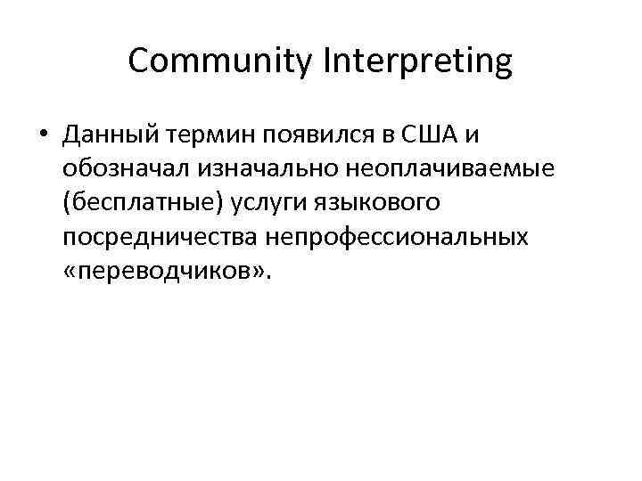 Community Interpreting • Данный термин появился в США и обозначал изначально неоплачиваемые (бесплатные) услуги языкового посредничества непрофессиональных «переводчиков» .