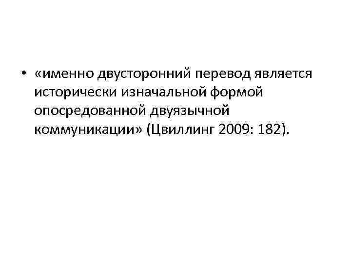 • «именно двусторонний перевод является исторически изначальной формой опосредованной двуязычной коммуникации» (Цвиллинг 2009: 182).