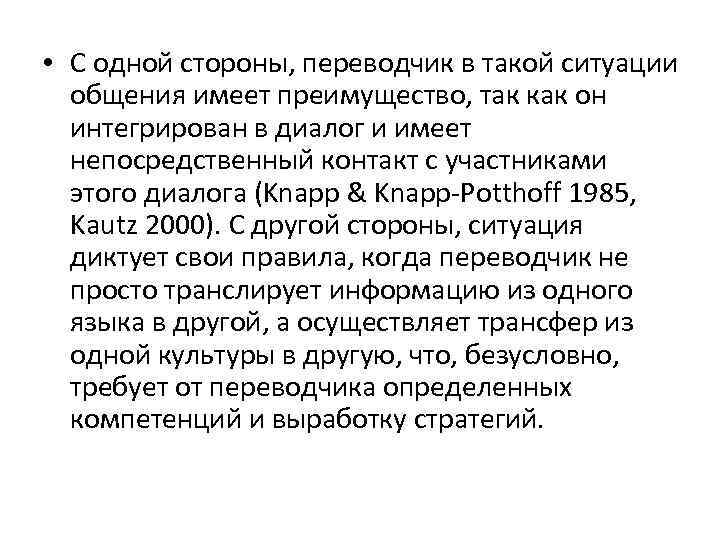 • С одной стороны, переводчик в такой ситуации общения имеет преимущество, так как он интегрирован в диалог и имеет непосредственный контакт с участниками этого диалога (Knapp & Knapp-Potthoff 1985, Kautz 2000). С другой стороны, ситуация диктует свои правила, когда переводчик не просто транслирует информацию из одного языка в другой, а осуществляет трансфер из одной культуры в другую, что, безусловно, требует от переводчика определенных компетенций и выработку стратегий.