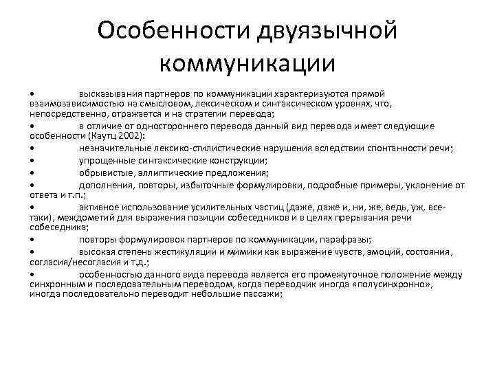 Особенности двуязычной коммуникации • высказывания партнеров по коммуникации характеризуются прямой взаимозависимостью на смысловом, лексическом и синтаксическом уровнях, что, непосредственно, отражается и на стратегии перевода; • в отличие от одностороннего перевода данный вид перевода имеет следующие особенности (Каутц 2002): • незначительные лексико-стилистические нарушения вследствии спонтанности речи; • упрощенные синтаксические конструкции; • обрывистые, эллиптические предложения; • дополнения, повторы, избыточные формулировки, подробные примеры, уклонение от ответа и т. п. ; • активное использование усилительных частиц (даже, даже и, ни, же, ведь, уж, всетаки), междометий для выражения позиции собеседников и в целях прерывания речи собеседника; • повторы формулировок партнеров по коммуникации, парафразы; • высокая степень жестикуляции и мимики как выражение чувств, эмоций, состояния, согласия/несогласия и т. д. ; • особенностью данного вида перевода является его промежуточное положение между синхронным и последовательным переводом, когда переводчик иногда «полусинхронно» , иногда последовательно переводит небольшие пассажи;