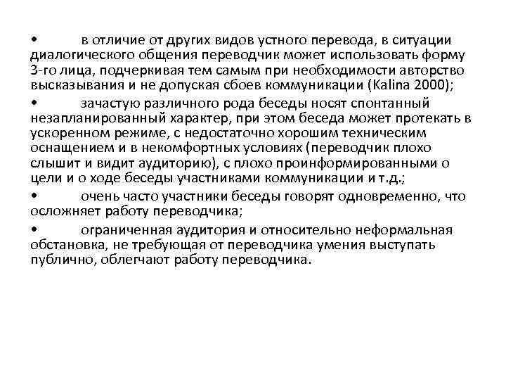 • в отличие от других видов устного перевода, в ситуации диалогического общения переводчик может использовать форму 3 -го лица, подчеркивая тем самым при необходимости авторство высказывания и не допуская сбоев коммуникации (Kalina 2000); • зачастую различного рода беседы носят спонтанный незапланированный характер, при этом беседа может протекать в ускоренном режиме, с недостаточно хорошим техническим оснащением и в некомфортных условиях (переводчик плохо слышит и видит аудиторию), с плохо проинформированными о цели и о ходе беседы участниками коммуникации и т. д. ; • очень часто участники беседы говорят одновременно, что осложняет работу переводчика; • ограниченная аудитория и относительно неформальная обстановка, не требующая от переводчика умения выступать публично, облегчают работу переводчика.
