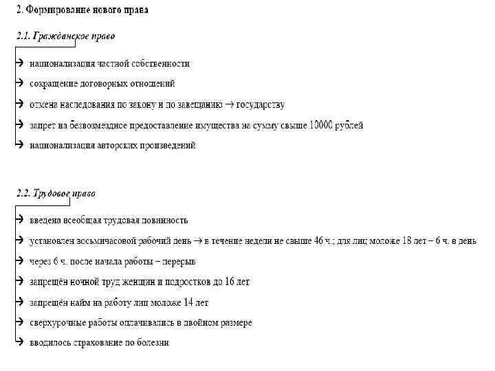 Земельное право. Первым законодательным актом земельного права был Декрет о земле, закрепивший землю в государственную, социалистическую собственность. Все прежние категории землевладения полностью упразднялись. Отсюда вытекал и принцип неотчуждаемости земли. Право распоряжения землей не предоставлялось ни организациям, ни отдельным лицам, а исключительно государству. Все остальные становились пользователями земли, которая передавалась и изымалась у них в силу административного акта органов государственного управления, а не на основании каких-либо договорных отношений. Закон о социализации земли, опубликованный 19 февраля 1918 г. , возлагал на земельные органы в качестве одной из важнейших задач развитие коллективных хозяйств в земледелии, закладывая основы развития колхозного движения. Уголовное право и процесс, преступления и виды наказаний изучить самостоятельно!