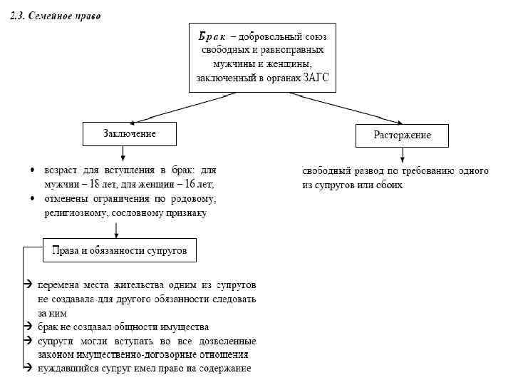 Был установлен новый порядок наследования. Наследование капиталистической собственности по закону и по завещанию отменялось. Наследовать можно было только трудовую собственность, не превышающую по стоимости 10 тыс. рублей. Семейное право полностью базировалось на новых, советских принципах. В декабре 1917 г. были приняты декреты о гражданском браке и о расторжении брака. В связи с отделением церкви от государства декретом отменялся церковный брак как обязательная форма брака и устанавливался гражданский (светский) брак, регистрируемый в соответствующих государственных органах (ЗАГСах). Устанавливалось равноправие вступающих в брак. Внебрачные дети уравнивались в правах с рожденными в браке. В спорных случаях отец внебрачного ребенка мог быть установлен в судебном порядке. Расторжение брака также изымалось из ведения церкви. Развод при обоюдном согласии супругов оформлялся на основе их заявления органами ЗАГСа. А при несогласии на развод одного из супругов дело решалось в суде.