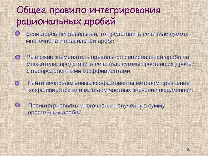 Общее правило интегрирования рациональных дробей Если дробь неправильная, то представить ее в виде суммы многочлена и правильной дроби. Разложив знаменатель правильной рациональной дроби на множители, представить ее в виде суммы простейших дробей с неопределенными коэффициентами Найти неопределенные коэффициенты методом сравнения коэффициентов или методом частных значений переменной. Проинтегрировать многочлен и полученную сумму простейших дробей. 10