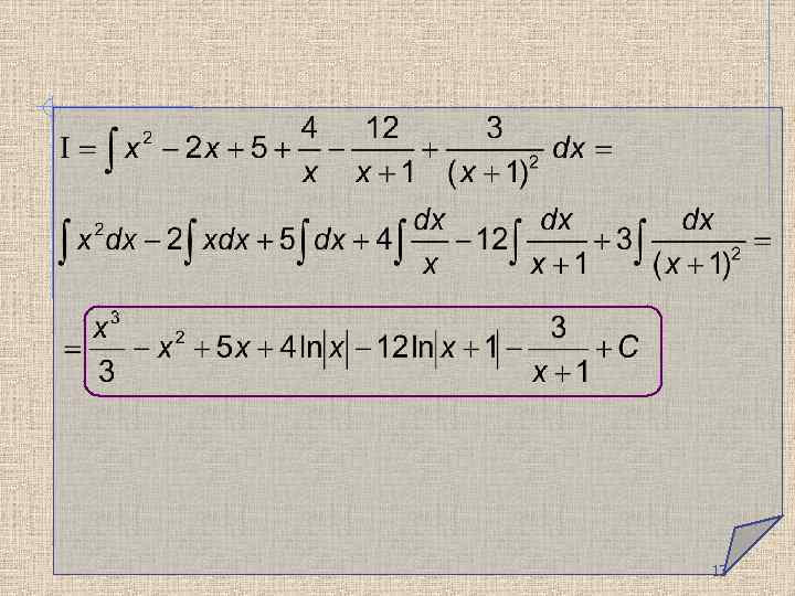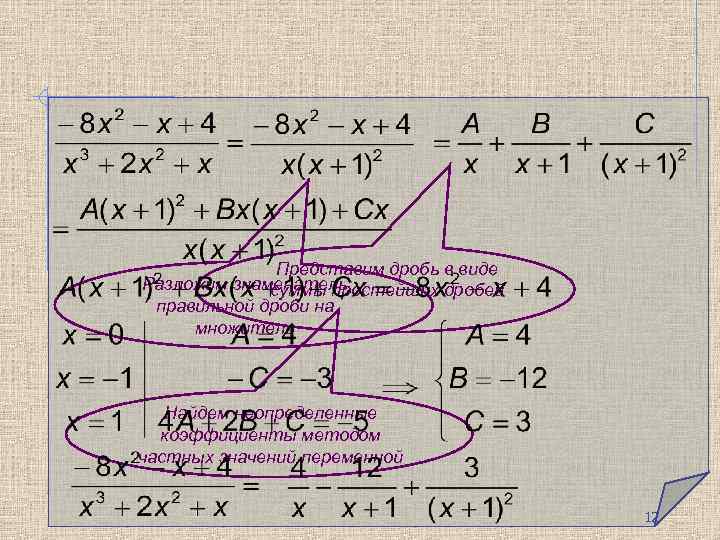 Представим дробь в виде Разложим знаменатель суммы простейших дробей правильной дроби на множители Найдем неопределенные коэффициенты методом частных значений переменной 12