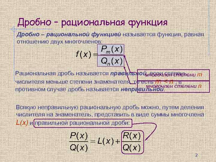 Дробно – рациональная функция Дробно – рациональной функцией называется функция, равная отношению двух многочленов: Рациональная дробь называется правильной, если степень многочлен степени m числителя меньше степени знаменателя, то есть m < n , в многочлен степени n противном случае дробь называется неправильной. Всякую неправильную рациональную дробь можно, путем деления числителя на знаменатель, представить в виде суммы многочлена L(x) и правильной рациональной дроби: 2