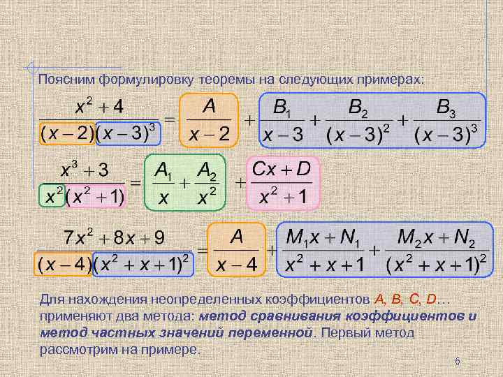 Поясним формулировку теоремы на следующих примерах: Для нахождения неопределенных коэффициентов A, B, C, D… применяют два метода: метод сравнивания коэффициентов и метод частных значений переменной. Первый метод рассмотрим на примере. 6