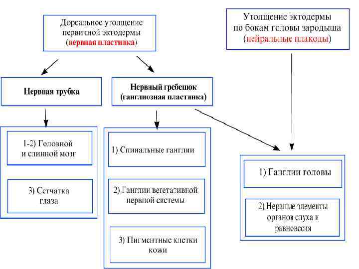 Развитие нервной ткани • Нервная ткань формируется из дорсального утолщения эктодермы – нервной пластинки, которая в процессе развития дифференцируется в нервную трубку, нейральные гребни. • Из нервной трубки образуется головной и спинной мозг. Нейральный гребень формирует ганглии (нервные узлы).
