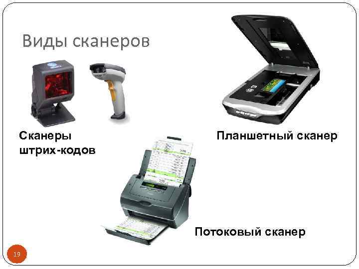 Виды сканеров Сканеры штрих-кодов Планшетный сканер Потоковый сканер 19