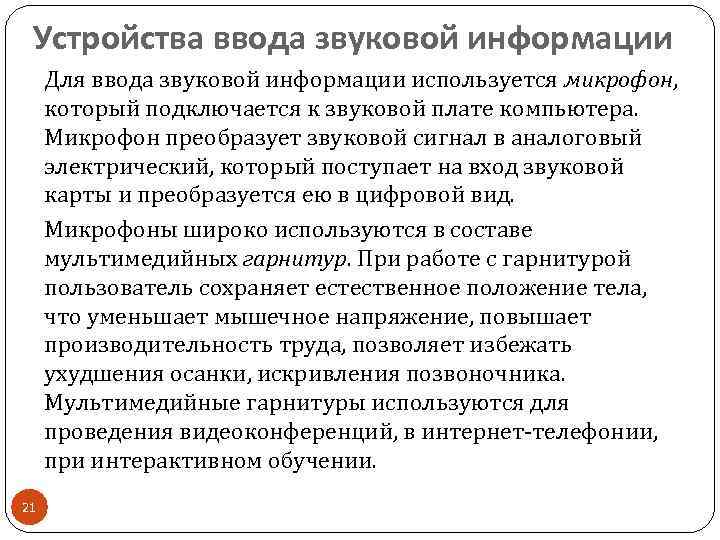 Устройства ввода звуковой информации Для ввода звуковой информации используется микрофон, который подключается к звуковой плате компьютера. Микрофон преобразует звуковой сигнал в аналоговый электрический, который поступает на вход звуковой карты и преобразуется ею в цифровой вид. Микрофоны широко используются в составе мультимедийных гарнитур. При работе с гарнитурой пользователь сохраняет естественное положение тела, что уменьшает мышечное напряжение, повышает производительность труда, позволяет избежать ухудшения осанки, искривления позвоночника. Мультимедийные гарнитуры используются для проведения видеоконференций, в интернет-телефонии, при интерактивном обучении. 21