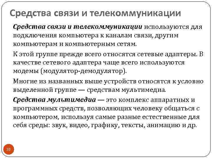 Средства связи и телекоммуникации используются для подключения компьютера к каналам связи, другим компьютерам и компьютерным сетям. К этой группе прежде всего относятся сетевые адаптеры. В качестве сетевого адаптера чаще всего используются модемы (модулятор-демодулятор). Многие из названных выше устройств относятся к условно выделенной группе — средствам мультимедиа. Средства мультимедиа — это комплекс аппаратных и программных средств, позволяющих человеку общаться с компьютером, используя самые разные естественные для себя среды: звук, видео, графику, тексты, анимацию и др. 39