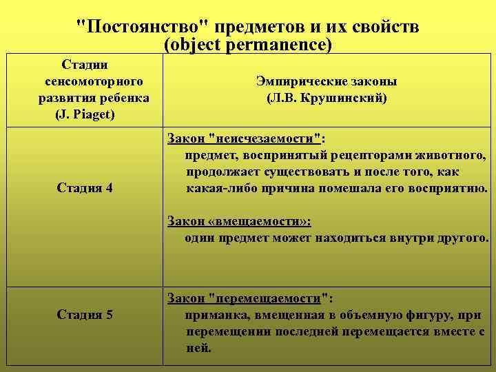"Постоянство" предметов и их свойств (оbject permanence) Стадии сенсомоторного развития ребенка (J. Piaget) Стадия 4 Эмпирические законы (Л. В. Крушинский) Закон "неисчезаемости": предмет, воспринятый рецепторами животного, продолжает существовать и после того, какая-либо причина помешала его восприятию. Закон «вмещаемости» : один предмет может находиться внутри другого. Стадия 5 Закон "перемещаемости": приманка, вмещенная в объемную фигуру, при перемещении последней перемещается вместе с ней.