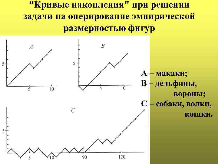 "Кривые накопления" при решении задачи на оперирование эмпирической размерностью фигур А – макаки; В – дельфины, вороны; С – собаки, волки, кошки.