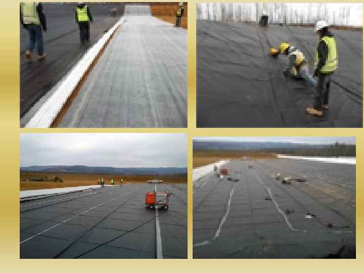 Новые технологии формирования защитного экрана хвостохранилища геомембраны Для гидроизоляции дна хвостохранилищ в настоящее время применяют геомембраны, бентоматы (специальные полиэтиленовые пленки), исключающие просачивание хвостов сквозь основание хвостохранилища. Хвостохранилище Сибайской ОФ Технология укладки: дно котлована застилается геотекстилем (специальная мягкая промышленная ткань), затем - геомембраны. При толщине в два миллиметра она выдерживает нагрузки - около 70 кг/см² килограммов на квадратный сантиметр. Стыки свариваются специальным агрегатом, их герметичность проверяется под большим давлением.