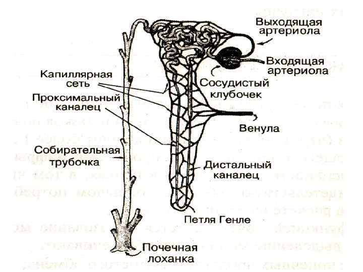 • Непосредственно от почечного тельца отходит проксимальный извитой каналец, который далее переходит в петлю Генле и дистальный извитой каналец; • Извитые канальцы и петля Генле густо оплетены капиллярной сетью, на которую распадается выходящая из сосудистого клубочка артериола;