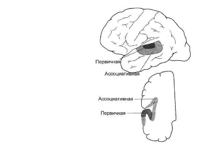 Структура слуховой сенсорной системы 3. корковый отдел — представлен четвертым нейроном, который находится в первичном (проекционном) слуховом поле в височной области коры больших полушарий и обеспечивает возникновение ощущения, а более сложная обработка звуковой информации происходит в расположенном рядом вторичном слуховом поле, отвечающем за формирование восприятия и опознание информации. Полученные сведения поступают в третичное поле нижнетеменной зоны, где интегрируются с другими формами информации.