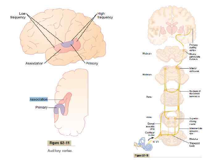 Центральные слуховые пути • Нижний холмик, медиальное коленчатое тело и слуховая кора содержат центральную ядерную (красная) и перицентральную опоясывающую части (розовая)
