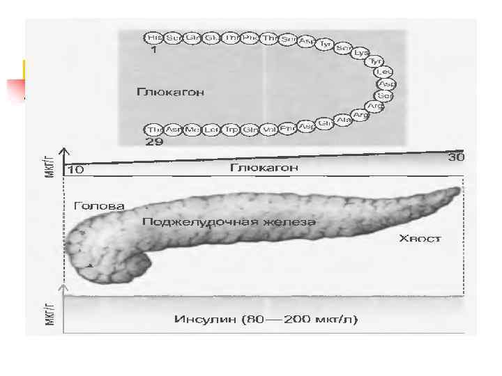 n n n Глюкагон — антагонист инсулина — стимулирует гликогенолиз и липолиз, что ведёт к быстрой мобилизации источников энергии (глюкоза и жирные кислоты). Ген глюкагона кодирует также структуру так называемых энтероглюкагонов — глицентина и глюкагоноподобного пептида 1 — стимуляторов секреции инсулина. Соматостатин подавляет в островках поджелудочной железы секрецию инсулина и глюкагона.