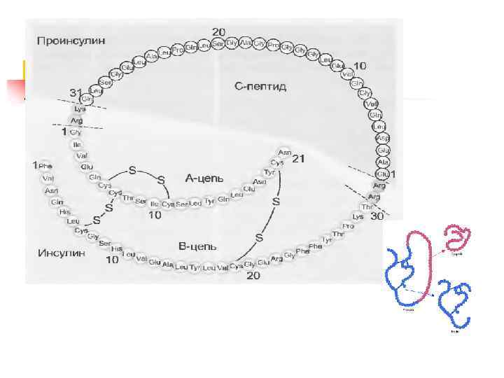 n n n В островках различают несколько типов клеток, продуцирующих гормоны: альфа-клетки образуют глюкагон, бета-клетки — инсулин, дельта-клетки — соматостатин, джи-клетки — гастрин n n n РР- или F-клетки — панкреатический полипептид. Помимо инсулина в бета-клетках синтезируется гормон амилин, обладающий противоположными инсулину эффектами.