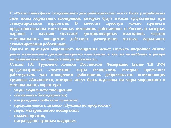 С учетом специфики сегодняшнего дня работодателем могут быть разработаны свои виды моральных поощрений, которые будут весьма эффективны при стимулировании персонала. В качестве примера можно привести представительства иностранных компаний, работающие в России, в которых наравне с жесткой системой дисциплинарных взысканий, мерами материального поощрения действует развернутая система морального стимулирования работников. Одним из примеров морального поощрения может служить досрочное снятие ранее наложенного дисциплинарного взыскания, а так же включение в резерв на выдвижение на вышестоящую должность. Статья 191 Трудового кодекса Российской Федерации (далее ТК РФ) предусматривает следующие меры поощрения, которые применяет работодатель для поощрения работников, добросовестно исполняющих трудовые обязанности, которые могут быть поделены на меры морального и материального характера: · меры морального поощрения: — объявление благодарности; — награждение почетной грамотой; — представление к званию «Лучший по профессии» ; · меры материального поощрения: — выдача премии; — награждение ценным подарком.