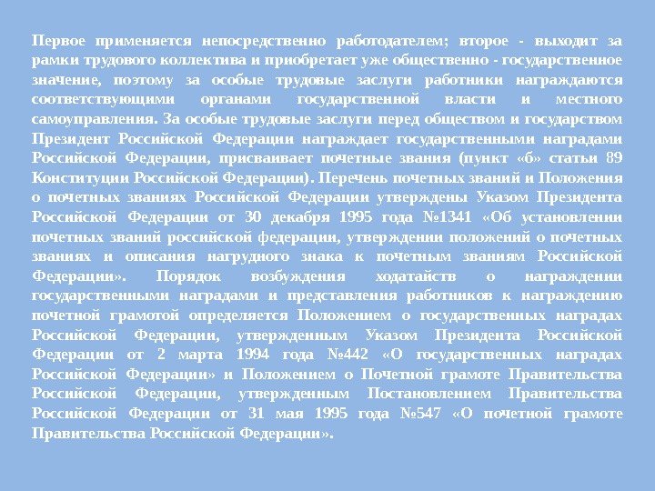 Первое применяется непосредственно работодателем; второе — выходит за рамки трудового коллектива и приобретает уже общественно — государственное значение, поэтому за особые трудовые заслуги работники награждаются соответствующими органами государственной власти и местного самоуправления. За особые трудовые заслуги перед обществом и государством Президент Российской Федерации награждает государственными наградами Российской Федерации, присваивает почетные звания (пункт «б» статьи 89 Конституции Российской Федерации). Перечень почетных званий и Положения о почетных званиях Российской Федерации утверждены Указом Президента Российской Федерации от 30 декабря 1995 года № 1341 «Об установлении почетных званий российской федерации, утверждении положений о почетных званиях и описания нагрудного знака к почетным званиям Российской Федерации» . Порядок возбуждения ходатайств о награждении государственными наградами и представления работников к награждению почетной грамотой определяется Положением о государственных наградах Российской Федерации, утвержденным Указом Президента Российской Федерации от 2 марта 1994 года № 442 «О государственных наградах Российской Федерации» и Положением о Почетной грамоте Правительства Российской Федерации, утвержденным Постановлением Правительства Российской Федерации от 31 мая 1995 года № 547 «О почетной грамоте Правительства Российской Федерации» .