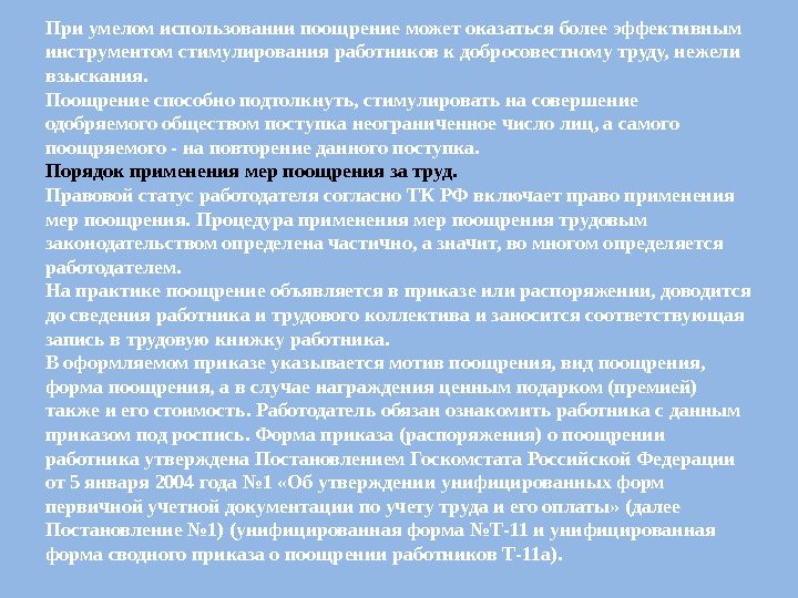 При умелом использовании поощрение может оказаться более эффективным инструментом стимулирования работников к добросовестному труду, нежели взыскания. Поощрение способно подтолкнуть, стимулировать на совершение одобряемого обществом поступка неограниченное число лиц, а самого поощряемого — на повторение данного поступка. Порядок применения мер поощрения за труд. Правовой статус работодателя согласно ТК РФ включает право применения мер поощрения. Процедура применения мер поощрения трудовым законодательством определена частично, а значит, во многом определяется работодателем. На практике поощрение объявляется в приказе или распоряжении, доводится до сведения работника и трудового коллектива и заносится соответствующая запись в трудовую книжку работника. В оформляемом приказе указывается мотив поощрения, вид поощрения, форма поощрения, а в случае награждения ценным подарком (премией) также и его стоимость. Работодатель обязан ознакомить работника с данным приказом под роспись. Форма приказа (распоряжения) о поощрении работника утверждена Постановлением Госкомстата Российской Федерации от 5 января 2004 года № 1 «Об утверждении унифицированных форм первичной учетной документации по учету труда и его оплаты» (далее Постановление № 1) (унифицированная форма №Т-11 и унифицированная форма сводного приказа о поощрении работников Т-11 а).