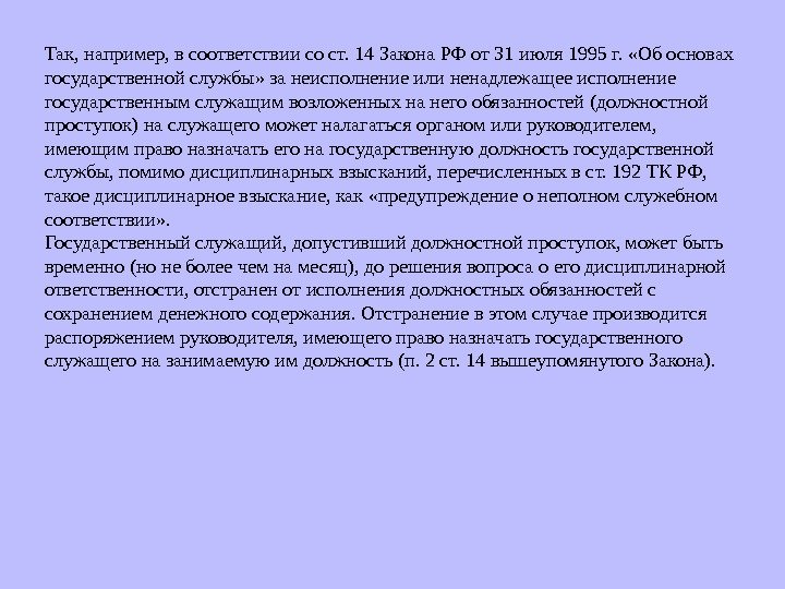 Так, например, в соответствии со ст. 14 Закона РФ от 31 июля 1995 г. «Об основах государственной службы» за неисполнение или ненадлежащее исполнение государственным служащим возложенных на него обязанностей (должностной проступок) на служащего может налагаться органом или руководителем, имеющим право на значать его на государственную должность государственной служ бы, помимо дисциплинарных взысканий, перечисленных в ст. 192 ТК РФ, такое дисциплинарное взыскание, как «предупреждение о неполном служебном соответствии» . Государственный служащий, допустивший должностной про ступок, может быть временно (но не более чем на месяц), до ре шения вопроса о его дисциплинарной ответственности, отстранен от исполнения должностных обязанностей с сохранением денеж ного содержания. Отстранение в этом случае производится распо ряжением руководителя, имеющего право назначать государствен ного служащего на занимаемую им должность (п. 2 ст. 14 выше упомянутого Закона).