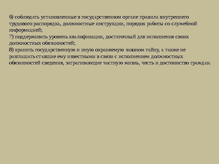 6) соблюдать установленные в государственном органе прави ла внутреннего трудового распорядка, должностные инструкции, порядок работы со служебной информацией; 7) поддерживать уровень квалификации, достаточный для исполнения своих должностных обязанностей; 8) хранить государственную и иную охраняемую законом тайну, а также не разглашать ставшие ему известными в связи с ис полнением должностных обязанностей сведения, затрагивающие частную жизнь, честь и достоинство граждан.