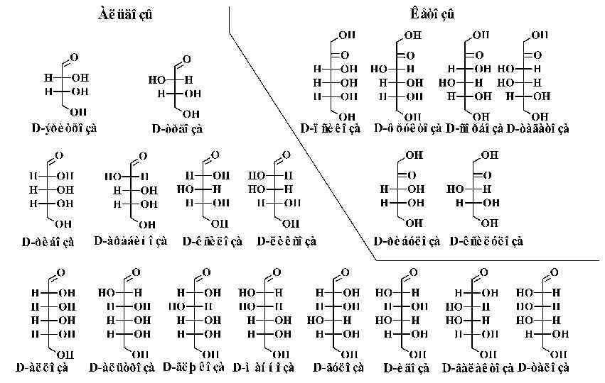 Сахара (углеводы) Номенклатура сахаров. В систематической номенклатуре для обозначения принадлежности молекулы к классу сахаров используют окончание -оза. Однако, сами названия в основном тривиальные. Сахара (углеводы) подразделяются по количеству атомов углерода в цепи (треозы, тетрозы, пентозы, гексозы и т. д. ), по наличию альдегидной или кетонной функции (альдозы и кетозы), по размеру цикла в циклических формах (фуранозы – пятичленный цикл и пиранозы – шестичленный цикл), а также по количеству сахарных остатков в молекуле (моносахариды, олигосахариды и полисахариды).