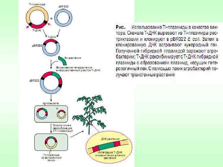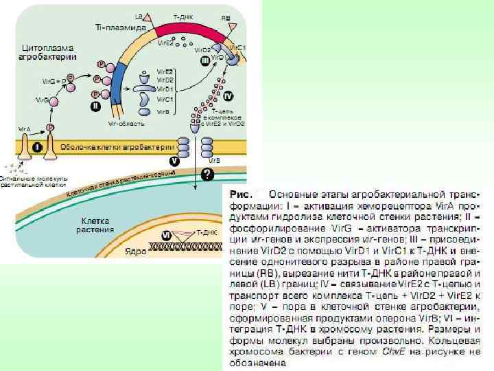 Agrobacterium tumifaciens — это бактерия, паразитирующая на растениях. В цитоплазме паразита содержится Ti — плазмида, в которой находится Т-ДНК, способная проникать в растительную клетку и встраиваться в ее геном, а также vir-гены, ответственные за осуществление этого процесса. Т-ДНК содержит гены синтеза необычных аминокислот и углеводов (опинов), которыми питается агробактерия, а также гены фитогормонов, индуцирующих опухолевое разрастание растительных тканей. Рецепторы на поверхности бактериальной клетки реагируют на продукты распада растительной клеточной стенки, в результате чего активируются virгены, продукты которых осуществляют репликацию и перенос Т-ДНК в клетку-реципиент.
