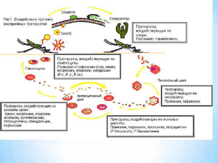 11. Лечение малярии. Этиотропные препараты делятся на 4 группы: 1. Гематошизотропные : 4 -хинолилметанолы: хинина : гидрохлорид, дигидрохлорид или сульфат, мефлохина гидрохлорид ; артемизинины: артемизинин, артесунат, артеметер ; 4 -аминохинолины: хлорохина дифосфат -син. делагил, хингамин, резохин ; диаминопиримидины пириметамин, триметоприм : бигуаниды : прогуанил ; сульфоны и сульфаниламиды : сульфадоксин, сульфаметоксазол ; антибиотики: доксициклин, клиндамицин, фторхинолоны. 2). Гистошизотропные средства - на тканевые стадии: пириметамин, прогуанил, доксициклин, тетрациклина гидрохлорид, и эффективные в отношении гипнозоитов P. vivax и P. ovale: 8 -аминохинолины -примахина дифосфат и хиноцид; 3) Гаметоцидные средства- примахина дифосфат и хиноцид ; 4) Споронтоцидные средства, предотвращающие формирование спорозоитов : пириметамин, прогуанил.