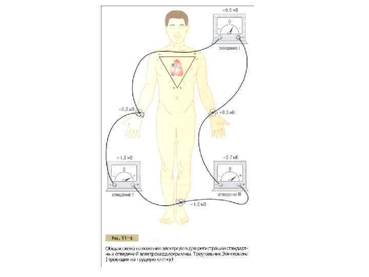 Треугольник Эйнтховена На рис. 11 6 вокруг местоположения сердца изображен треугольник, который называют треугольником Эйнтховена. Эта схема показывает, что обе руки и левая нога образуют вершины треугольника, окружающего сердце. Две вершины в верхней части треугольника представляют собой точки, откуда электрические токи по электропроводящим средам организма распространяются к верхним конечностям. Нижняя вершина — это точка, откуда идет распространение токов к левой ноге.