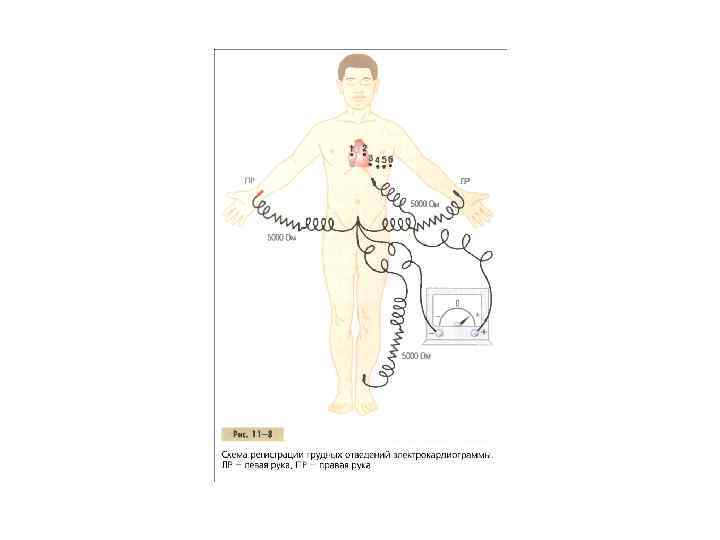 • Отведением является сочетание двух элек тродов, провода от которых идут к прибору. В этом случае образуется полный замкнутый контур, включающий тело пациента и электрокардиограф. • На рис. 11 6 в каждом отведении представлен простой электроизмерительный прибор, хотя на самом деле электрокардиограф является высокочувствительным аппаратом, снабженным лентопротяжным механизмом.