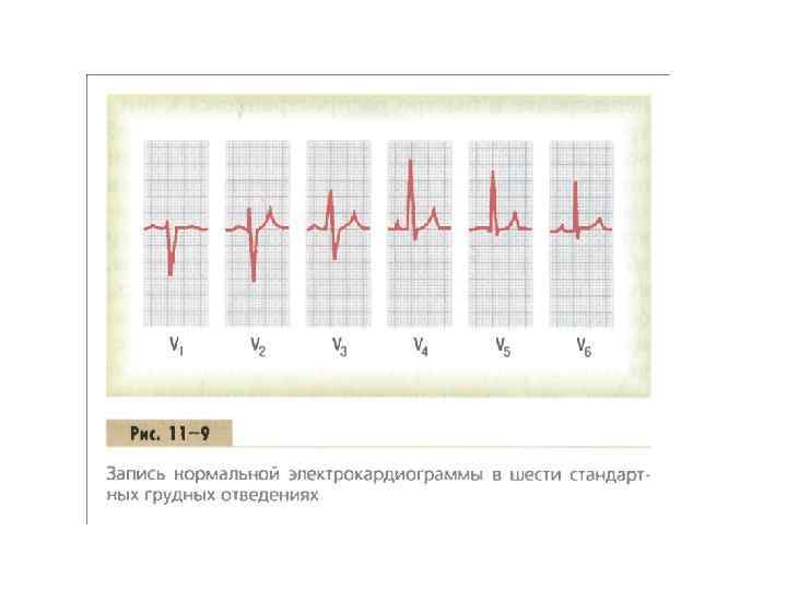 На рис. 11 9 представлена запись грудных отведений электрокардиограммы здорового сердца. Поскольку сердце расположено вблизи грудной стенки, в каждом грудном отведении регистрируется электрический потенциал участка миокарда, расположенного непосредственно под электродом. Малейшие изменения состояния сердца, особенно передней стенки желудочков, отчетливо проявляются в соответствующих отдельных грудных отведениях электрокардиограммы.