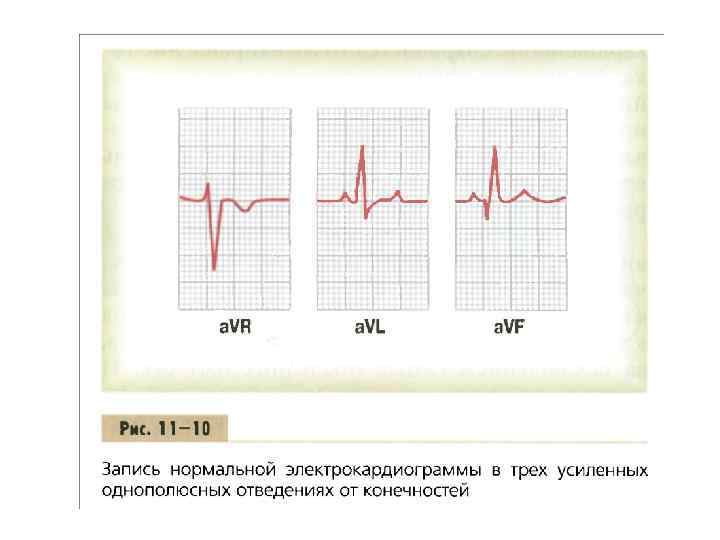 • На рис. 11 10 приведена запись нормальной электрокардиограммы в трех усиленных отведениях от конечностей. Она похожа на запись электрокардиограммы в стандартных отведениях, и только в отведении a. VR зубцы на кривой электрокардиограммы в основном отрицательные.