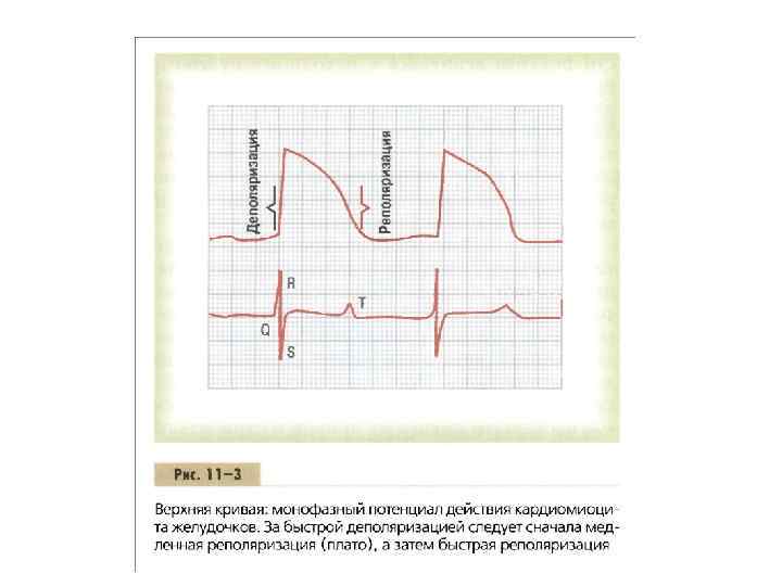 • Связь между монофазным потенциалом действия кардиомиоцита желудочков и волнами QRS и Т стандартной электрокардиограммы. Монофазный потенциал действия миокардиального волокна желудочков, обычно продолжается от 0, 25 до 0, 35 сек. В верхней части рис. 11 3 представлен такой потенциал, зарегистрированный с помощью микроэлектрода, введенного внутрь волокна. Скачок потенциала вызван деполяризацией мембраны, а возврат потенциала к исходному уровню вызван ее реполяризацией.