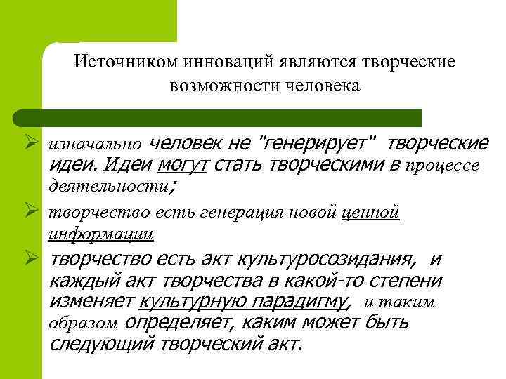 Источником инноваций являются творческие возможности человека Ø изначально человек не "генерирует" творческие идеи. Идеи могут стать творческими в процессе деятельности; Ø творчество есть генерация новой ценной информации Ø творчество есть акт культуросозидания, и каждый акт творчества в какой-то степени изменяет культурную парадигму, и таким образом определяет, каким может быть следующий творческий акт.